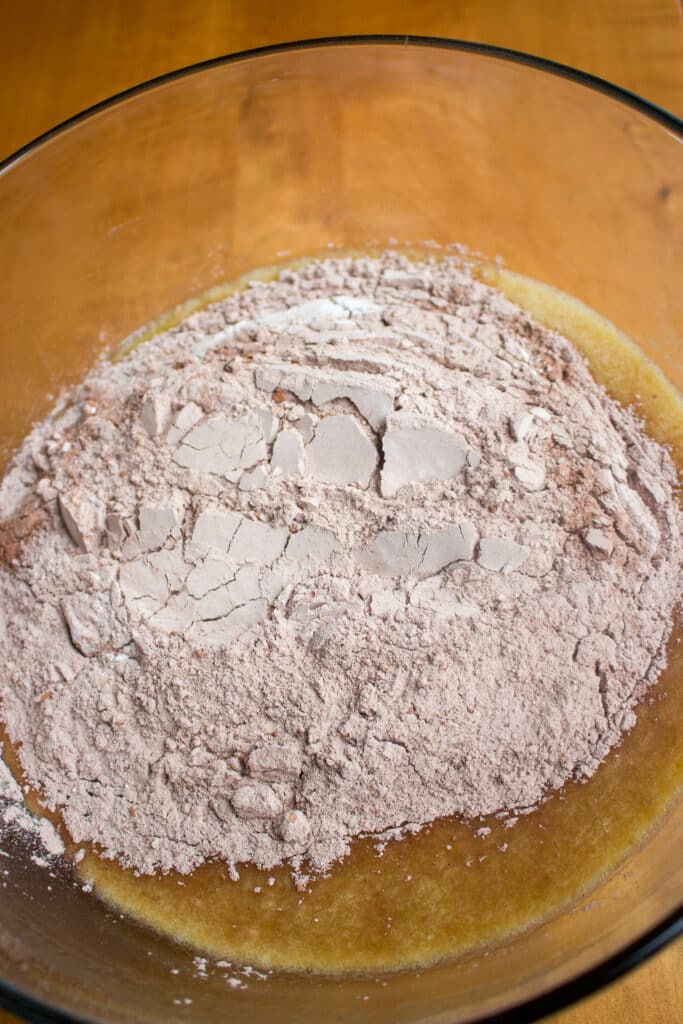- In a bowl, add the flour, sifted cocoa, baking soda, baking powder, cornstarch, and salt. Stir to combine and set aside.1 3/4 cups all-purpose flour, 1/3 cup unsweetened cocoa powder, 1 tsp baking soda, 2 tsp baking powder, 2 tsp cornstarch, 1/4 tsp salt
