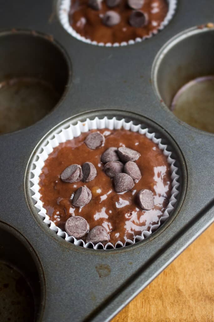 - Scoop and divide the batter evenly between the liners. Sprinkle extra chocolate chips on top if desired.