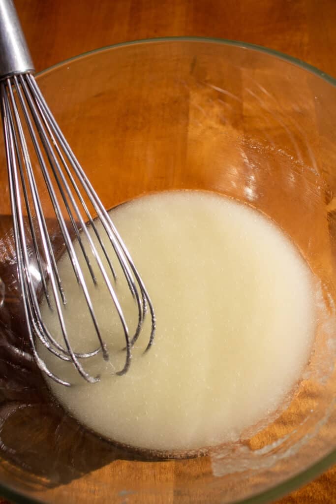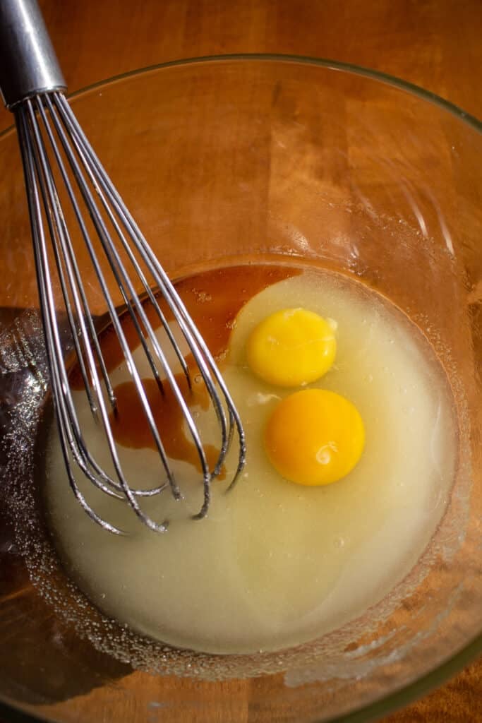 Step 3 - Whisk wet ingredients. In a large bowl, whisk the oil and sugar. Then add in eggs and vanilla and continue whisking. Then whisk in the milk and jam. Whisk for 2-3 minutes until well combined.