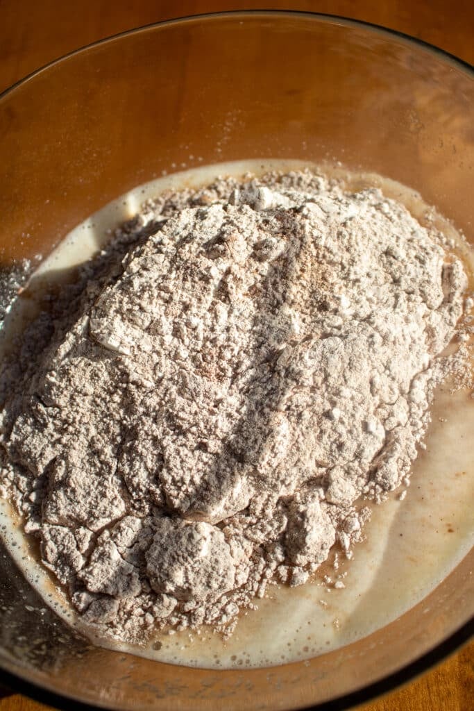 - In a bowl, add the dry ingredients. Stir to combine and set aside.2 1/2 cups all-purpose flour, 1 tbsp unsweetened cocoa powder, 2 tsp baking powder, 1 tsp baking soda, 2 tsp cornstarch, 1 1/2 tsp cinnamon, 1 tsp ginger, 1/2 tsp cloves, 1/4 tsp nutmeg
