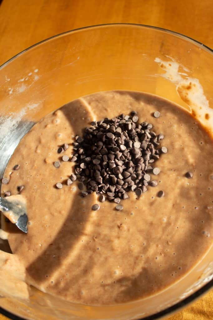 - Add the mini chocolate chips in and mix a few times just until evenly distributed.1/2 cup mini chocolate chips*