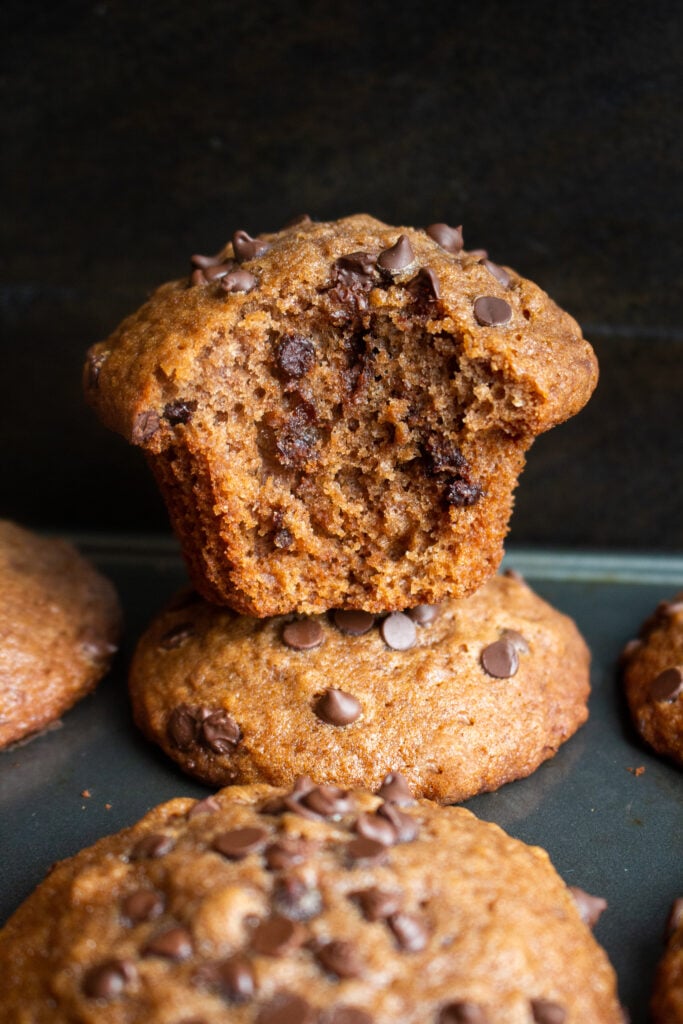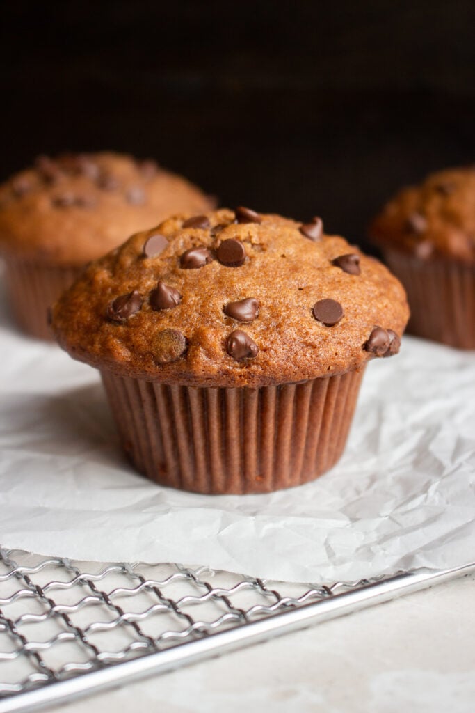 The key to tall and bakery-style muffins is filling the batter all the way and adding a few extra chocolate chips on top too. That will give you that bakery-style dome!