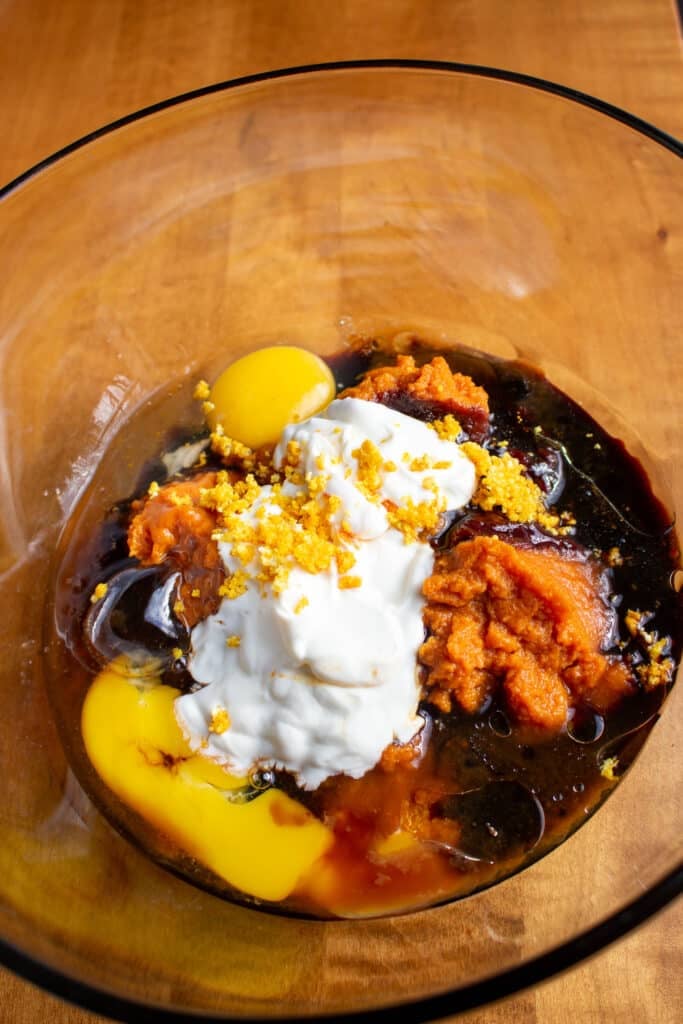 - In a large bowl, add the brown sugar, white sugar eggs, vanilla, oil, sour cream, pumpkin, molasses, and orange zest. Whisk to combine (1-2 minutes) until well combined.1/3 cup molasses, 1 cup pumpkin puree, 1/3 cup oil, 1/4 cup sour cream, 2 large eggs, 1 tbsp vanilla, 2/3 cups dark brown sugar, 1/2 cup white sugar, 1 tbsp orange zest