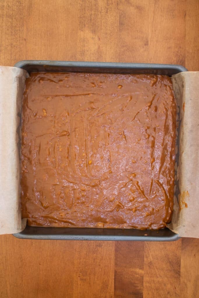 - Preheat the oven to 350℉/176℃ and line a 9x9 baking pan with parchment paper and set aside.