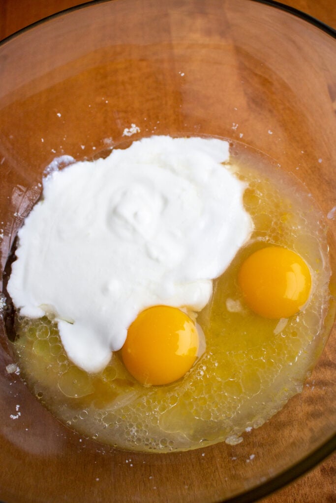 - Into the same bowl with the lemon sugar mixture, add eggs, vanilla, lemon juice, oil, and yogurt. Whisk to combine for another one or two minutes.2/3 cups oil, 3/4 cups plain yogurt, 1/4 cup lemon juice, 2 large eggs, 1 tsp vanilla