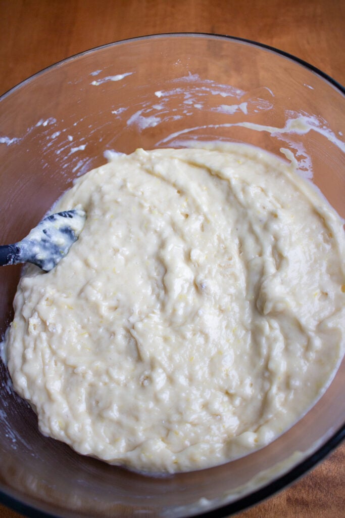 Step 4 - Whisk in wet ingredients. Add in the oil, lemon juice, eggs, vanilla, and greek yogurt. Whisk until well combined (1-2 minutes).