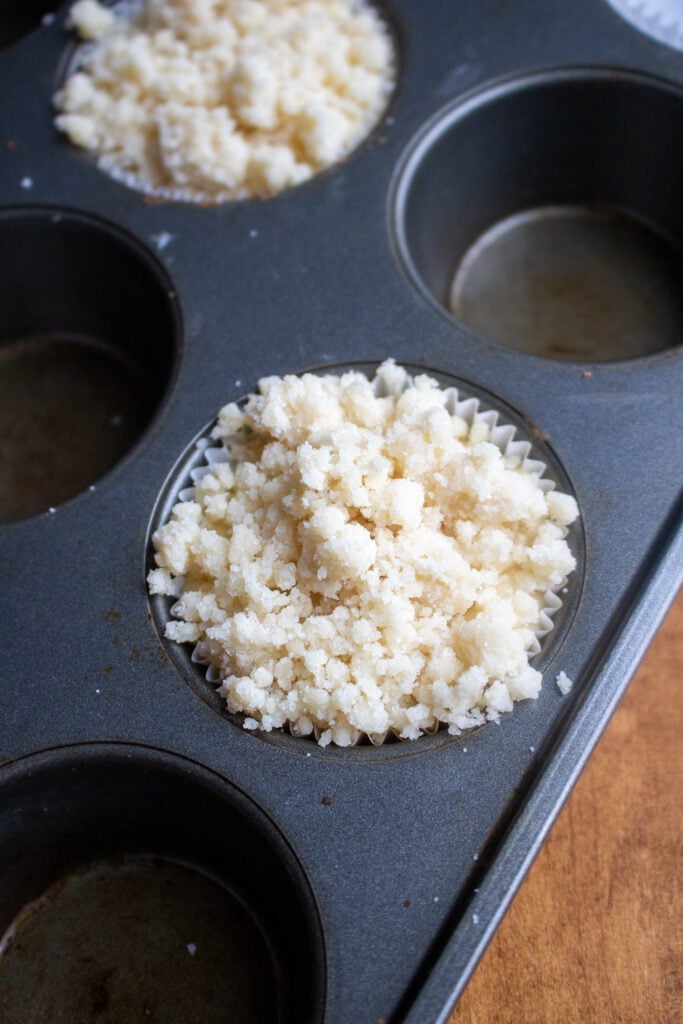 - Divide the batter evenly between the liners, filling them up to the top. Add a handful of streusel on top of each muffin.