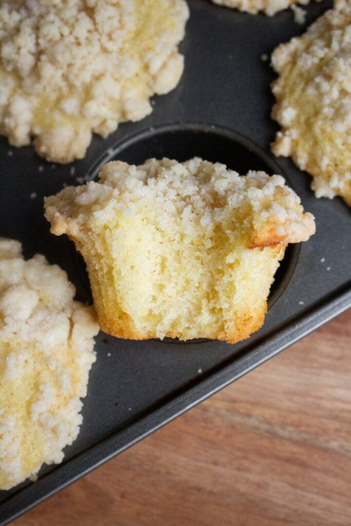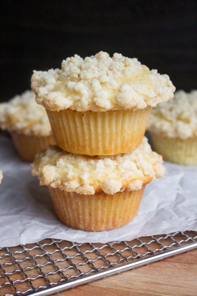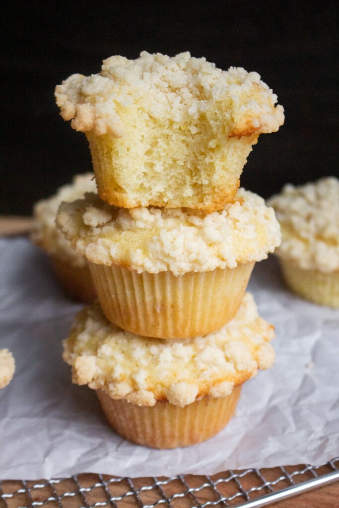 These lemon crumb muffins are light, tender, and so delicious! They have a super light muffin crumb that reminds me of warm, sunny days. The buttery sugar lemons streusel melts and crisps up while baking, adding the perfect sweet crunch! There's the perfect balance of sweet and tangy in every bite.