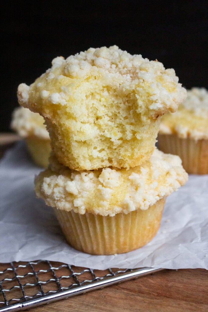 These lemon crumb muffins are light, tender, and so delicious! They have a super light muffin crumb that reminds me of warm, sunny days. The buttery sugar lemons streusel melts and crisps up while baking, adding the perfect sweet crunch! There's the perfect balance of sweet and tangy in every bite.