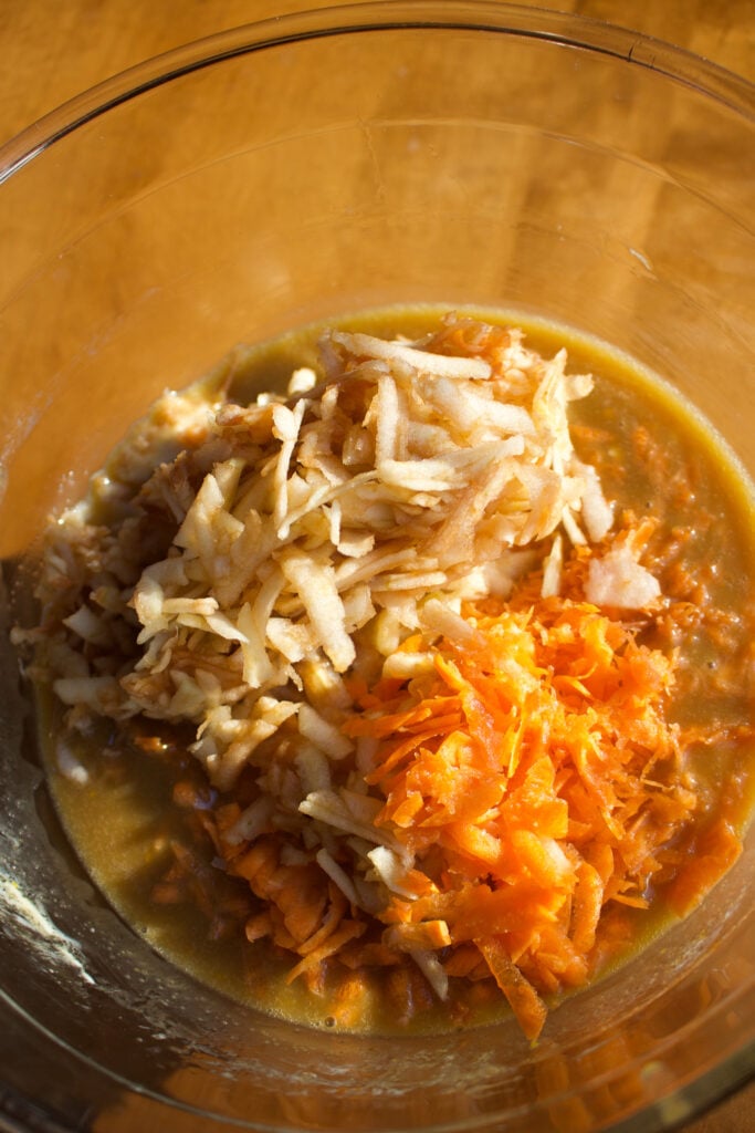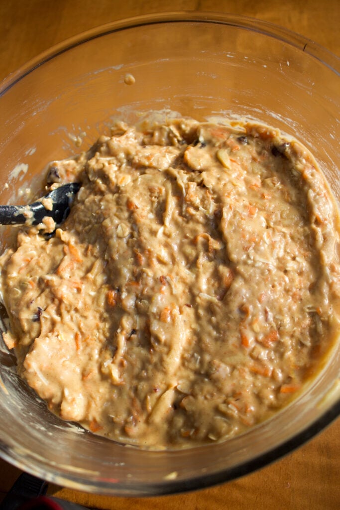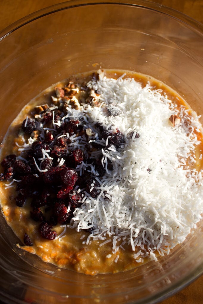 Step 4 - Whisk in add-ins. Add in the shredded carrots and apples and whisk until combined. Then add in the coconut, pecans, and dried cranberries in. Whisk until well combined and evenly distributed.