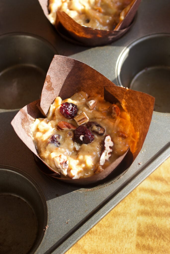 Here is how to make and bake these Morning Glory Muffins. You will need a 12 muffin tin, muffin liners, 3 mixing bowls, a spatula, and a whisk.