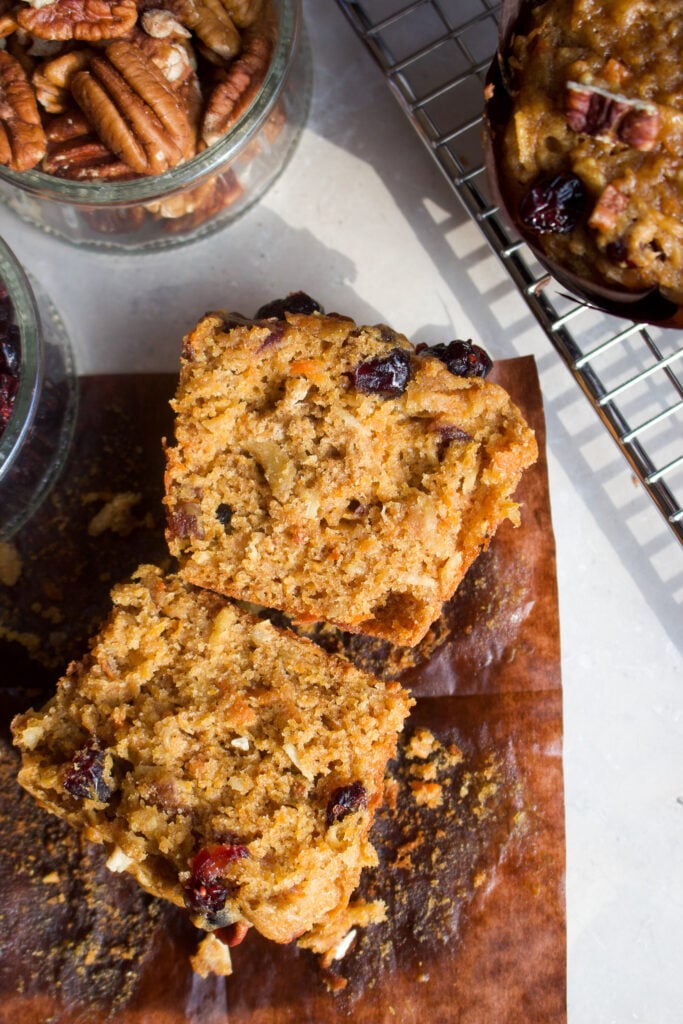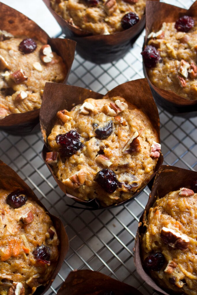 Morning glory muffins are hearty fruit and vegetable-filled muffins with the best texture! They typically have shredded apple, carrots, and coconut in them. Then you can add a crunchy nut (like pecans or walnuts) in, and dried raisins or cranberries!