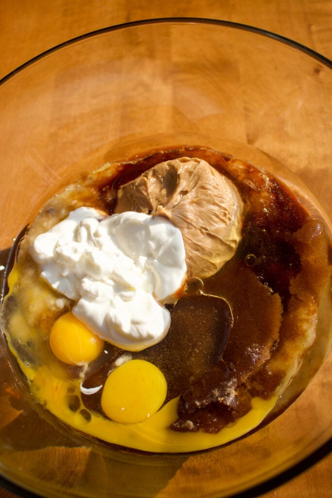 - In a bowl, add the mashed bananas, brown sugar, oil, eggs, vanilla, peanut butter, and sour cream. Whisk well to combine.1 1/4 cups bananas, 3/4 cups creamy peanut butter, 3/4 cups dark brown sugar, 2 large eggs, 1 tbsp vanilla, 1/2 cup sour cream, 1/2 cup oil