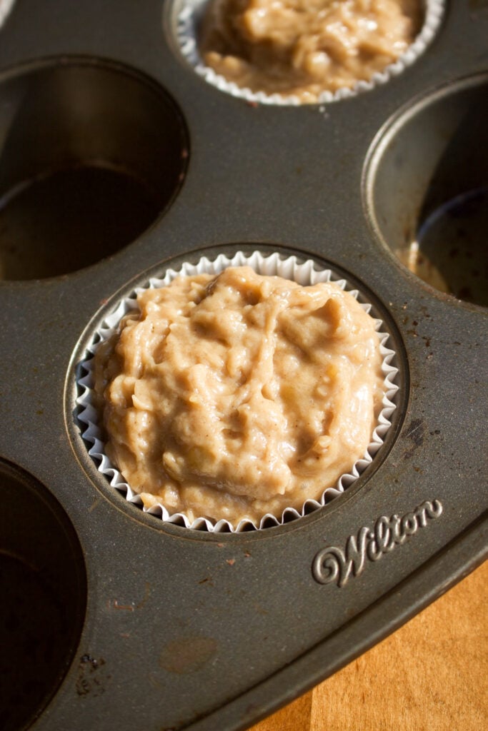 Step 5 - Scoop. Divide the batter evenly between the liners, filling them all the way to the top.
