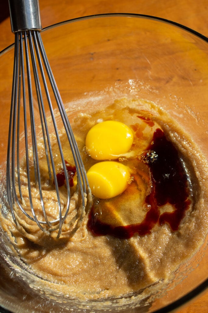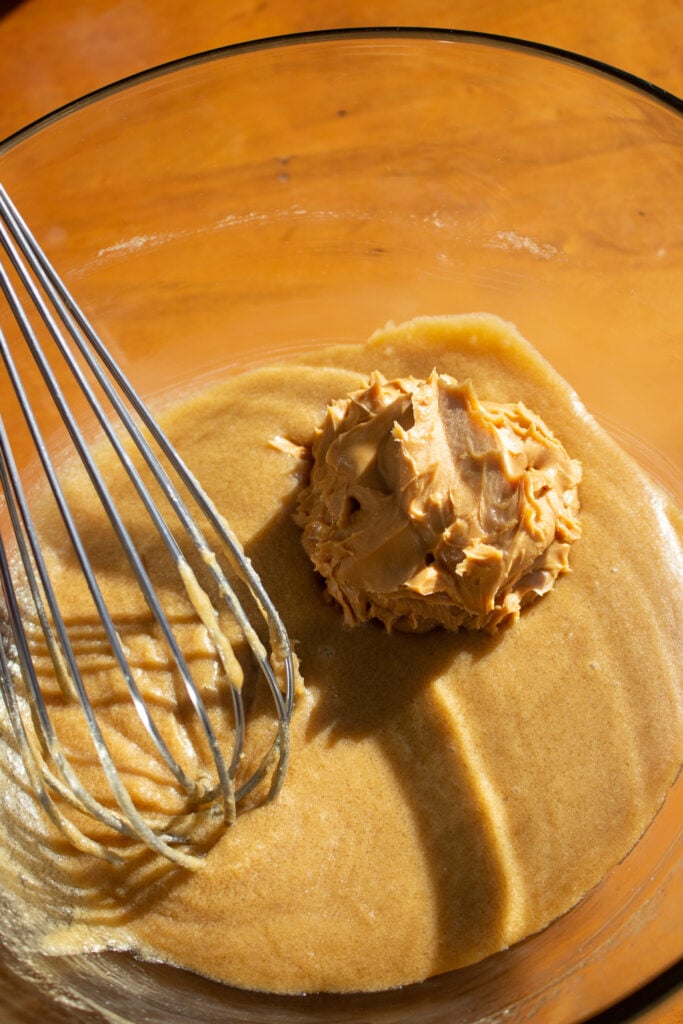 Step 3 - Add wet ingredients. Whisk in the eggs and vanilla. Then add in the creamy peanut butter and whisk until smooth.