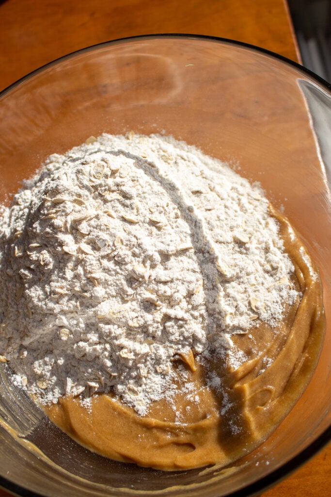 - In a bowl, add the flour, oats, baking soda, baking powder, cinnamon, cornstarch, and salt. Stir to combine and set aside.