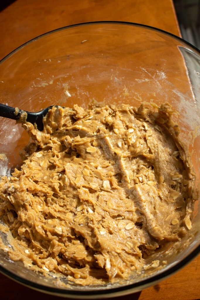 - Add in the eggs and vanilla, and continue whisking. Then add in the peanut butter and whisk until smooth, scraping the sides of the bowl as needed.
