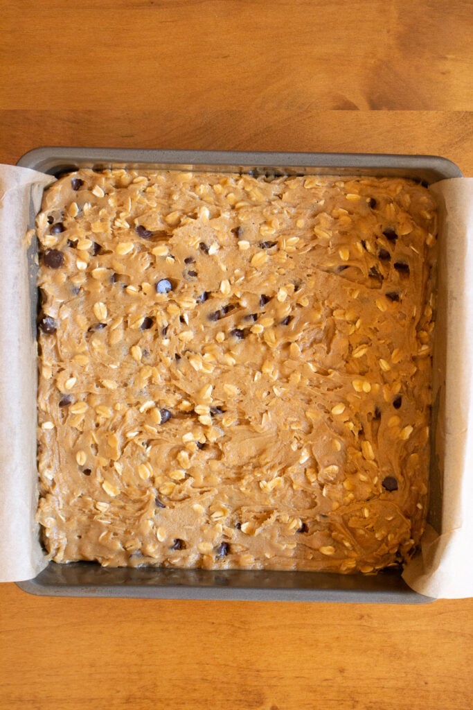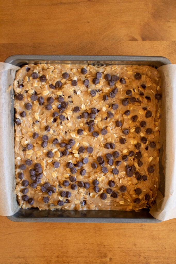 - Transfer into the prepared pan and spread evenly. Top with extra chocolate chips if desired.