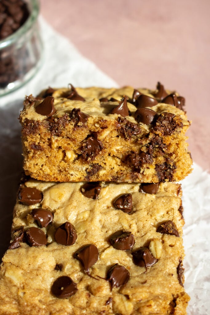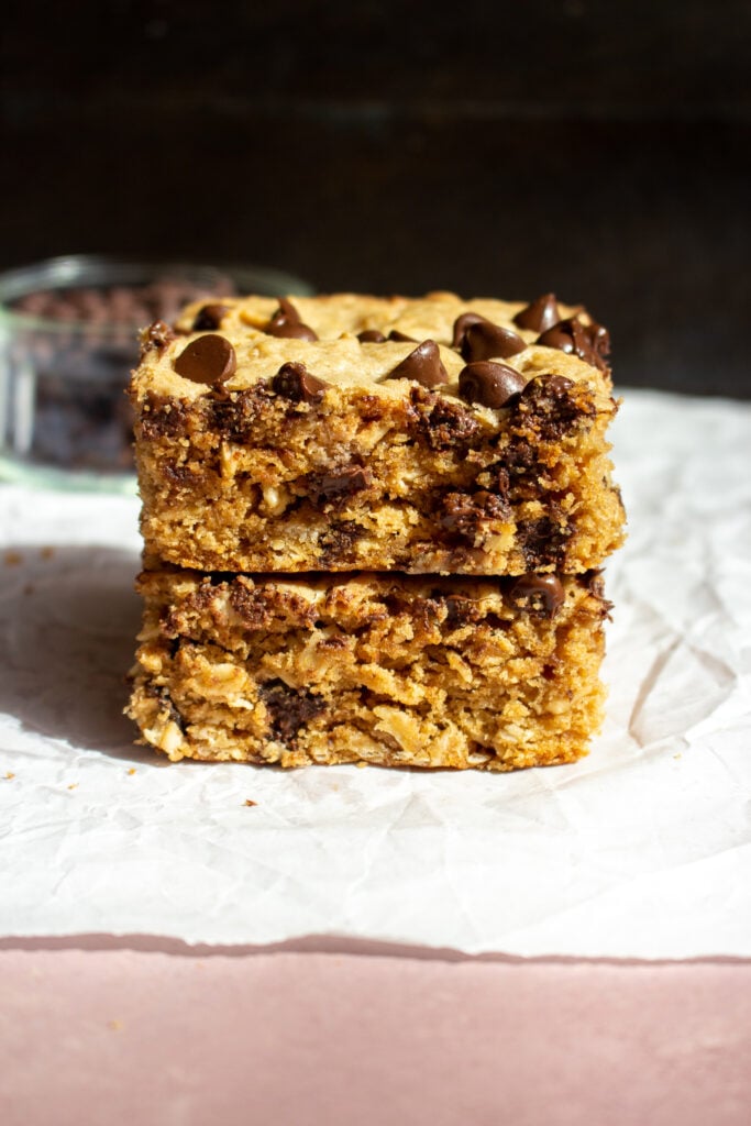 Okay these oatmeal bars are so delicious! If you know me, you know I love a good oat bar. Now add in the chocolate peanut butter combo and I am IN!