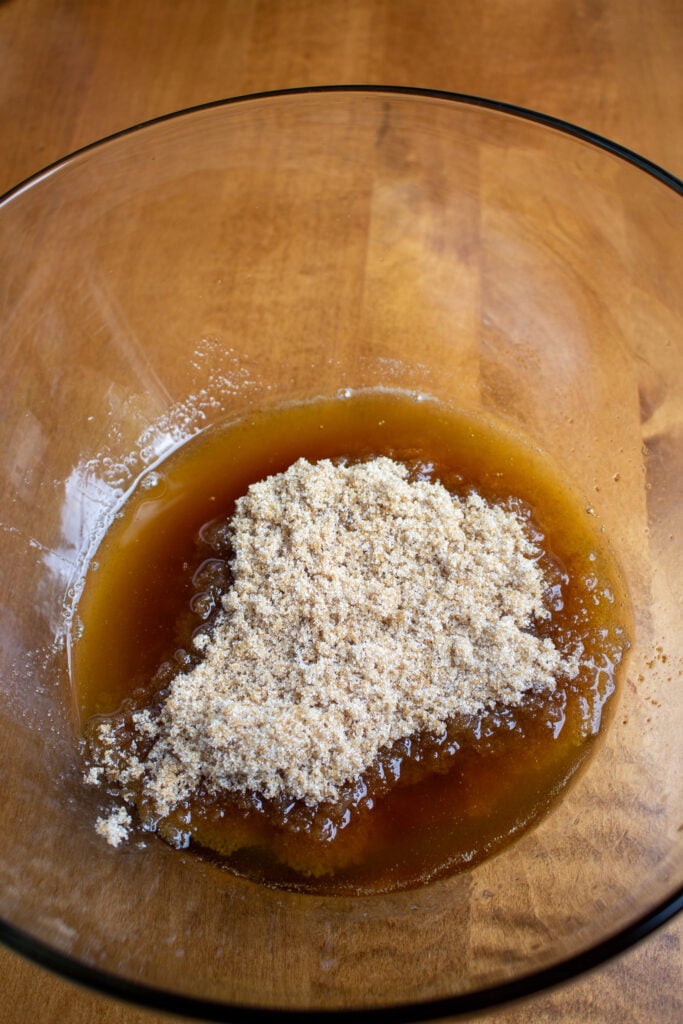 Step 2 - Whisk wet ingredients. In a large bowl, whisk the melted and cooled brown butter, brown sugar, and white sugar. Whisk for 1-2 minutes.