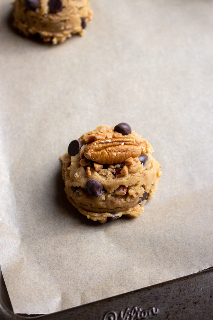 Step 6 - Scoop and bake. Scoop 6 cookies at a time per tray, placing them about 2-3 inches apart from one another. I scooped 2 tbsp per cookie, and used a cookie scooper. Add an extra pecan on top if desired.