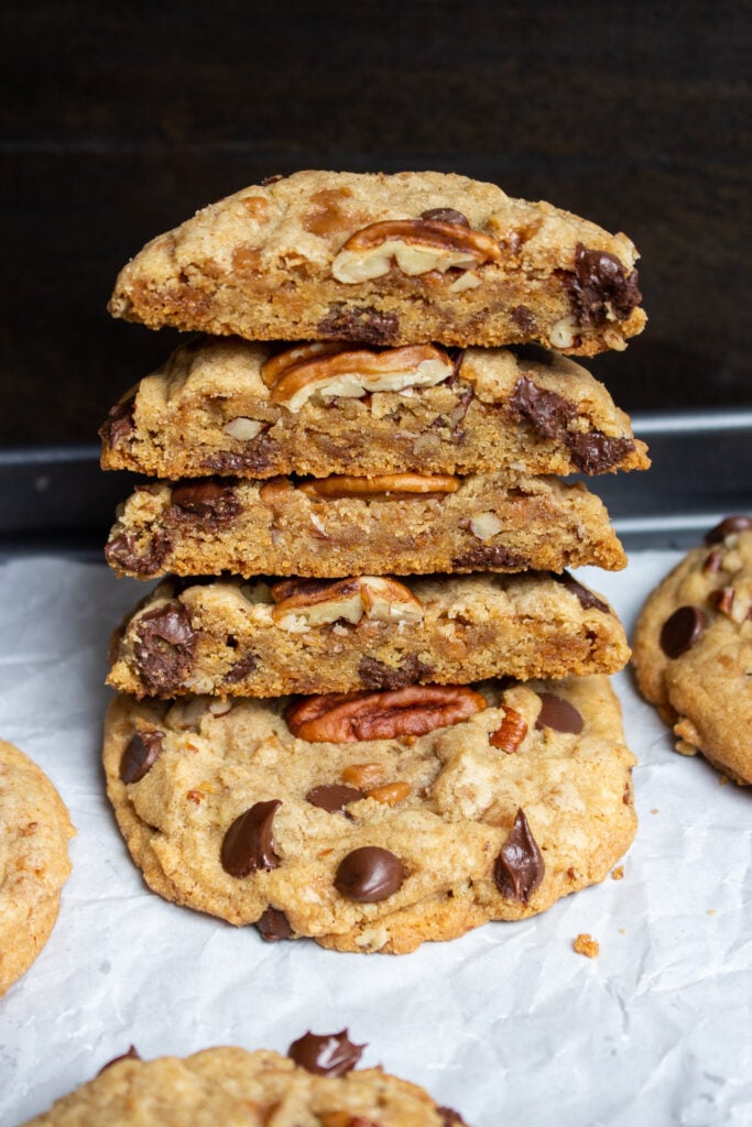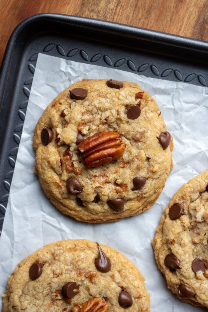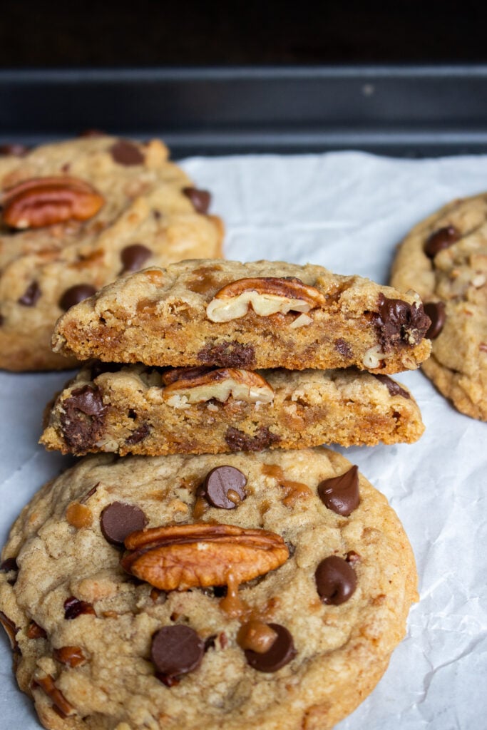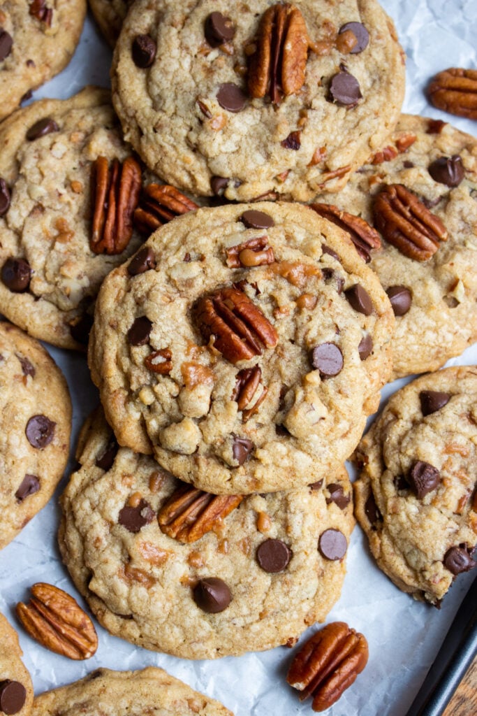 They have crisp brown buttery edges, and perfect middles. Every bite is full of sweet toffee, gooey chocolate, and crunchy pecans! The brown butter really elevates the flavors and brings them to the next level.