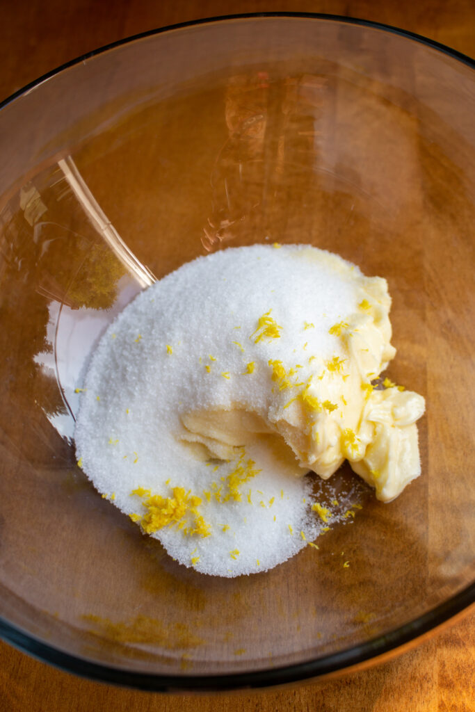 Step 3 - Cream butter and sugar. In a large bowl, add the softened, butter, white sugar, and lemon zest. Cream on high for 2-3 minutes until well combined, scraping the sides of the bowl as needed.