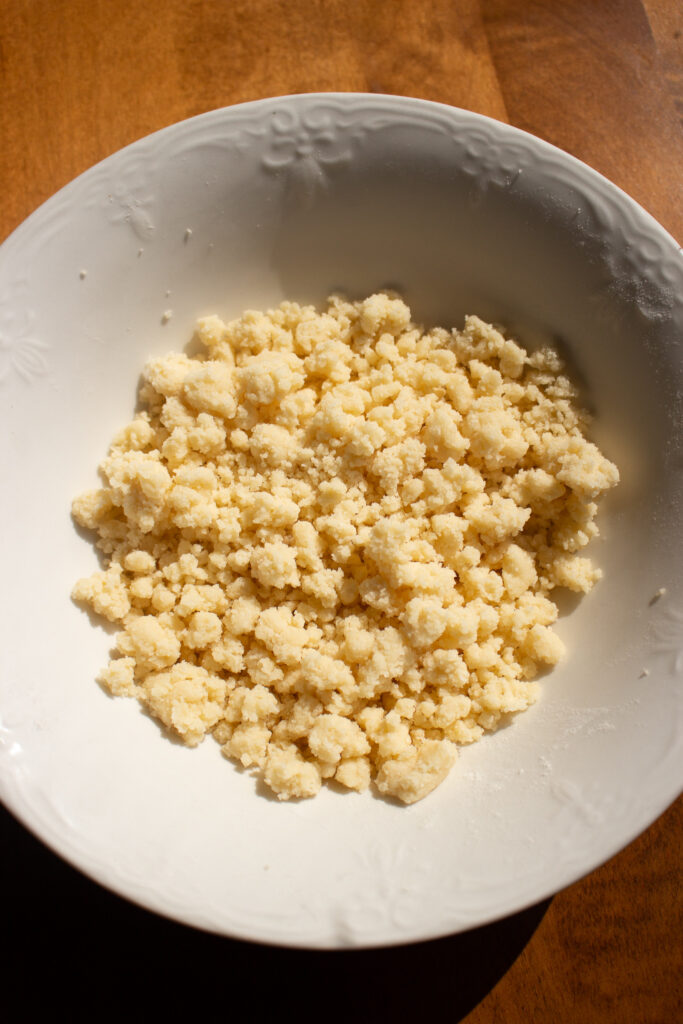 Step 2 – Make streusel. In a bowl, add the butter, flour, and white sugar. With your hands or a fork, mix together until a crumbly streusel forms. Set in the fridge to chill as the cake batter is made.