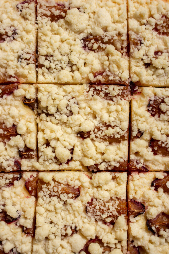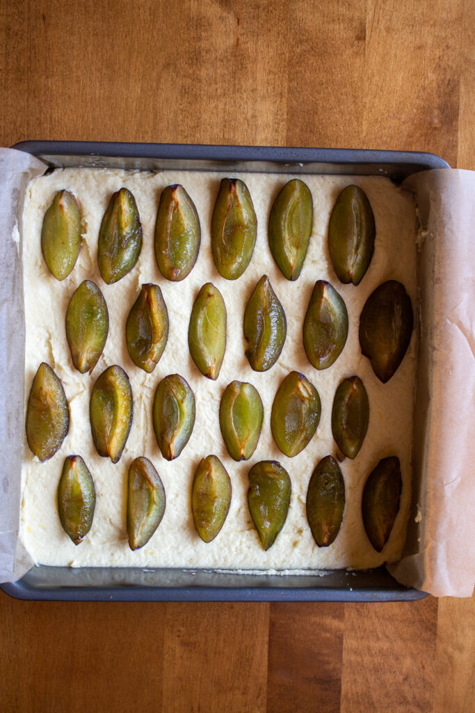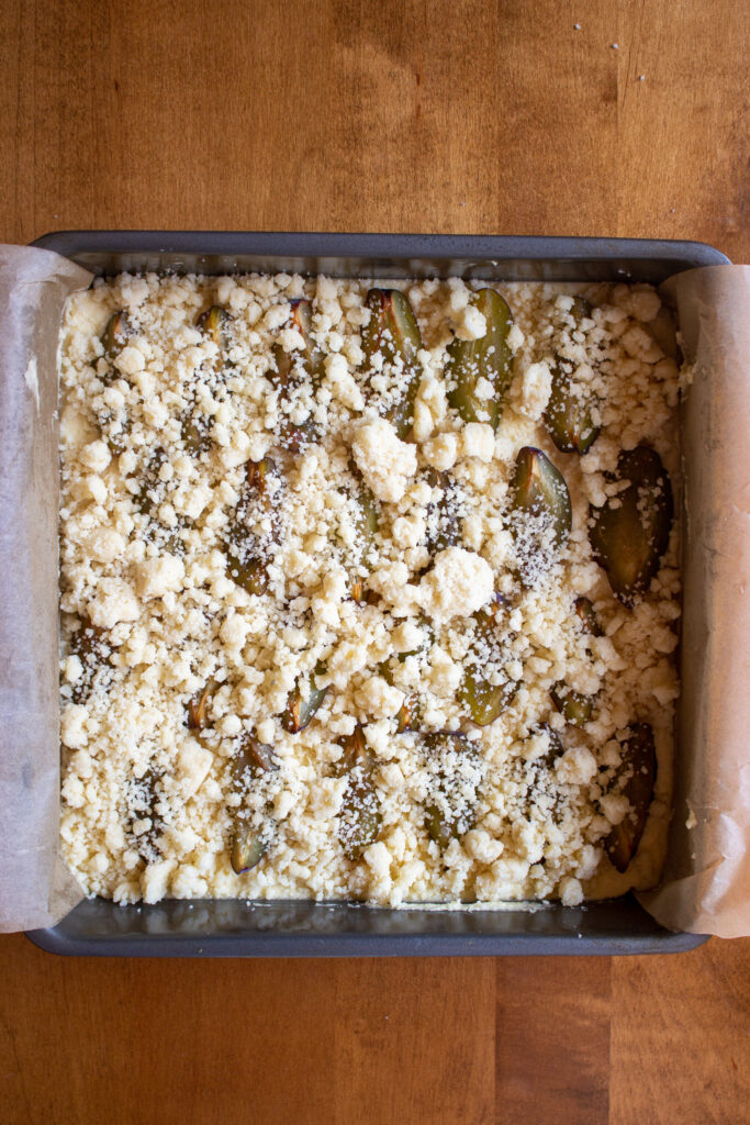 - Transfer and spread evenly into the prepared pan. Add the plums evenly on top. Finish with sprinkling the streusel.