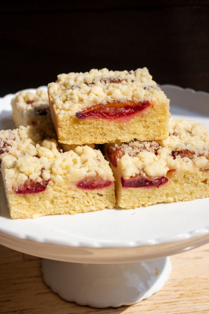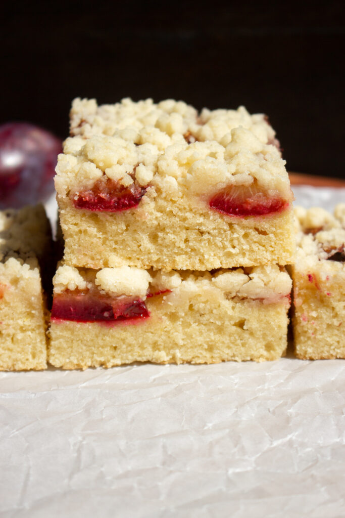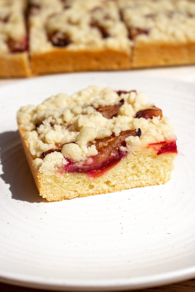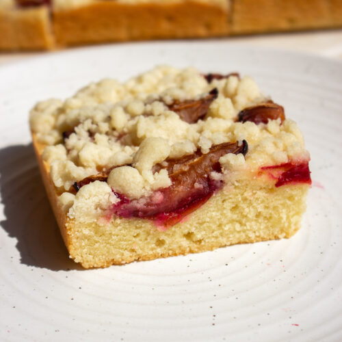 The cake is a simple and soft lemon-vanilla cake. It gets topped with fresh plums, and sprinkled with a buttery sugar streusel. The streusel melts and bakes into the cake so well. It's perfectly sweet in all the right ways!