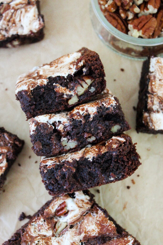 Rocky Road Brownies are fudgy brownies with gooey chocolate and pecan pieces throughout. Each bite has pockets of gooey chocolate and pecans! Before the brownies are baked, marshmallow fluff is swirled on top of the batter!