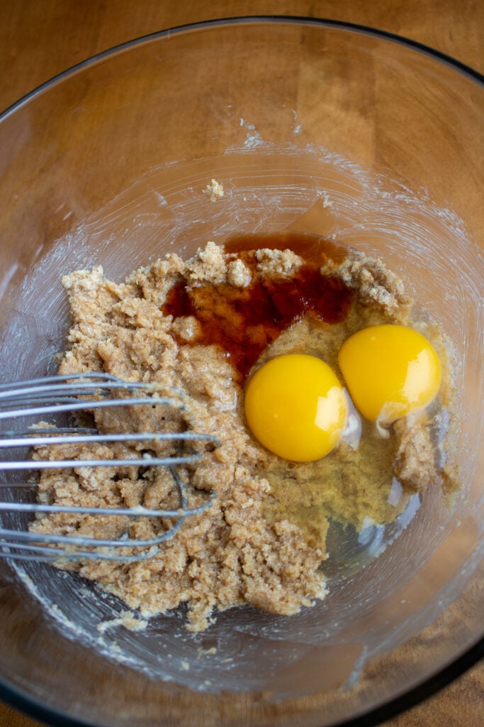 Step 3 - Whisk in sugars, eggs, and vanilla. Whisk the cooled brown butter and sugars together. Then add in the eggs and vanilla. Whisk together until well combined.