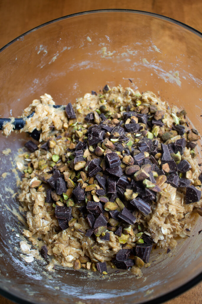 Here is how to make and bake these Salted Pistachio Chocolate Chunk Oatmeal Cookies. You will need two trays lined with parchment paper, a large mixing bowl, a spatula, a whisk, and a standard ice cream scoop.
