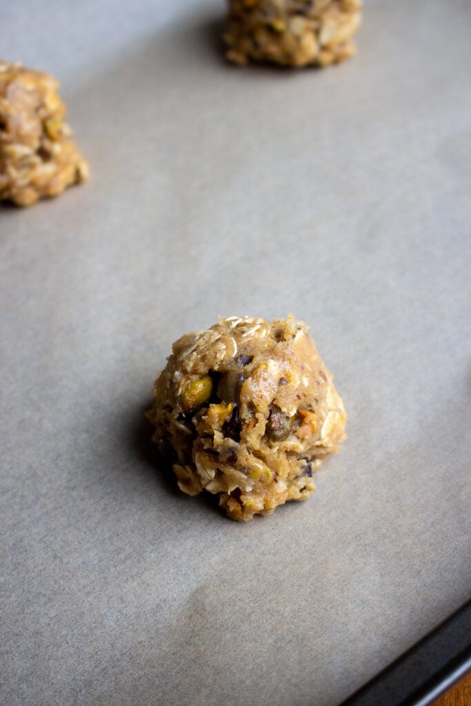 - Scoop the cookies onto a cookie tray (I scooped 6 per tray and used a 2 tbsp cookie scooper), spacing them evenly apart from one another. Add extra pistachios and chocolate on top if desired.