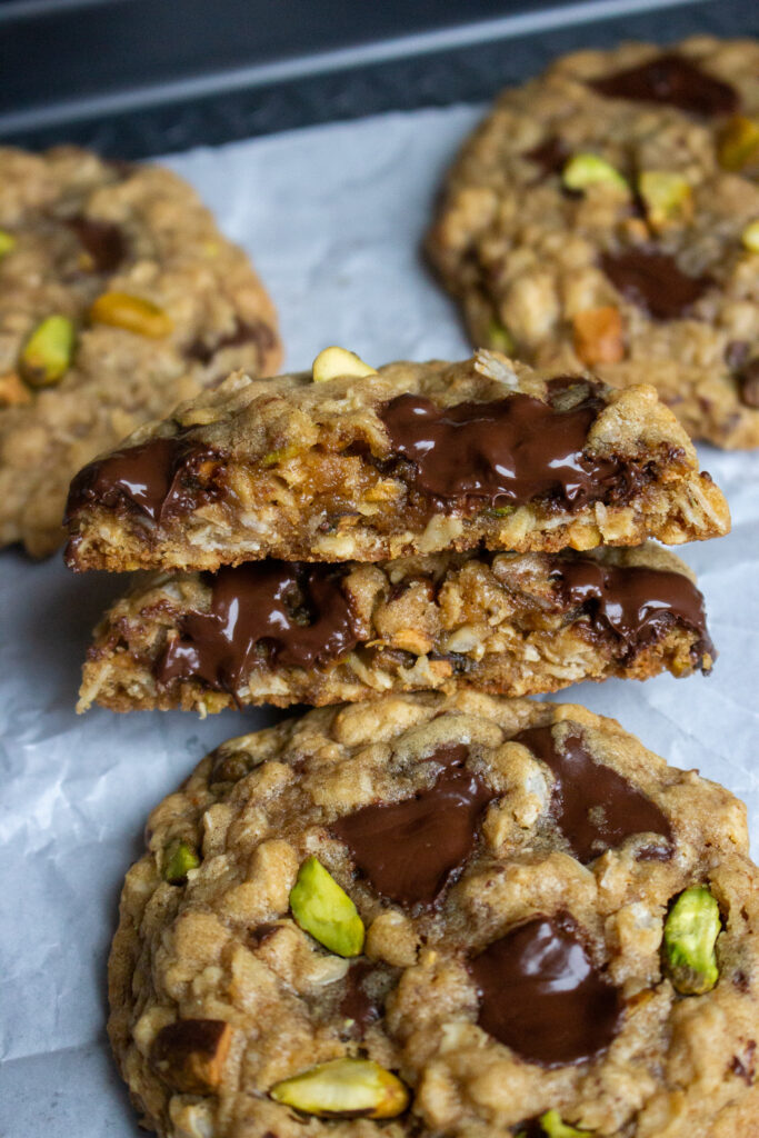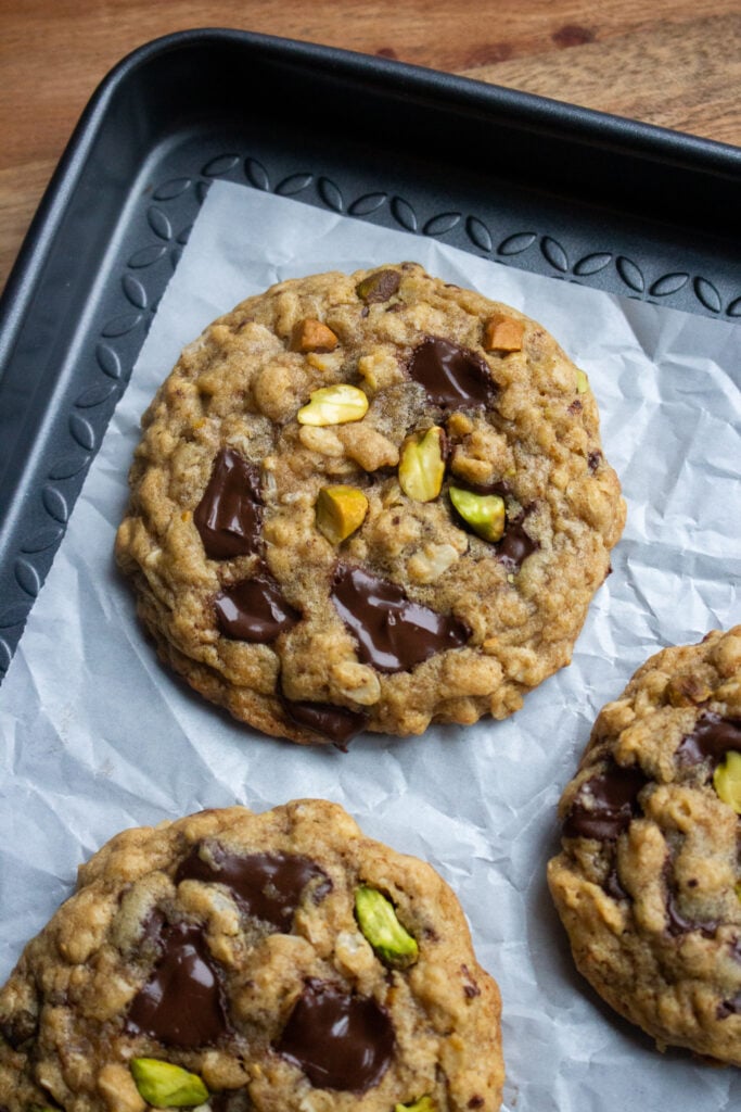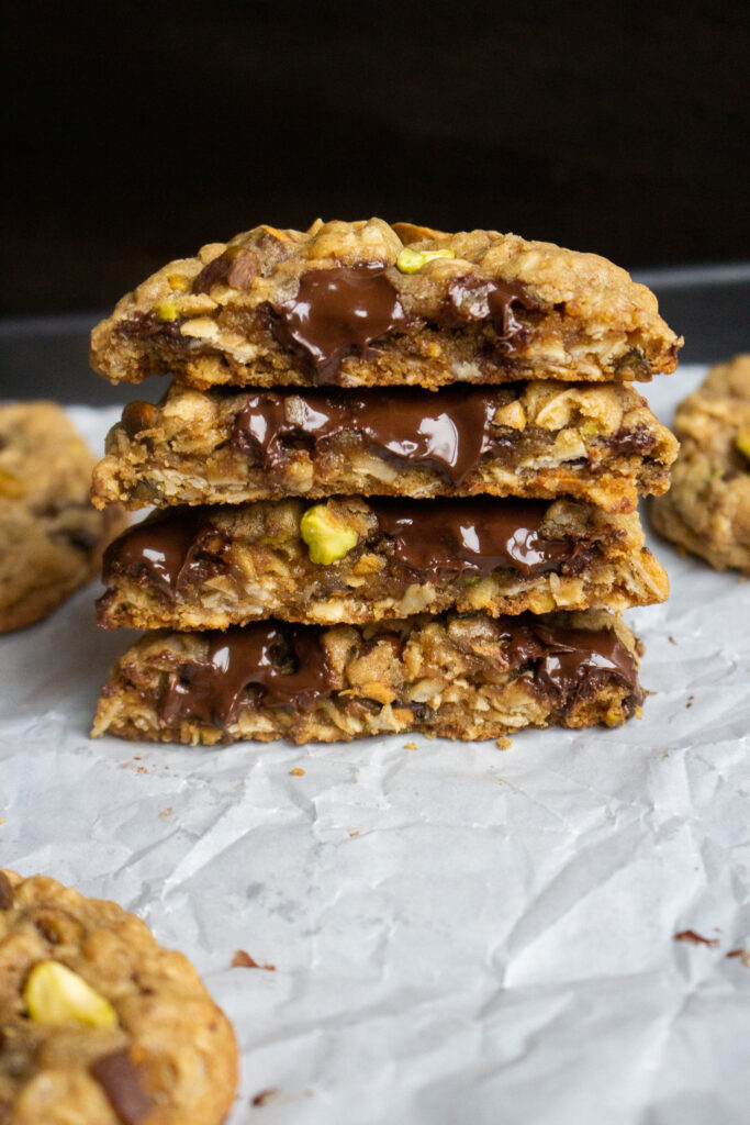 These chewy pistachio oatmeal cookies are incredible. I think the sweet-and-salty combination is what puts them over the top. I already love a classic oatmeal cookie, but loaded with roasted pistachios and rich dark chocolate? Count me in!