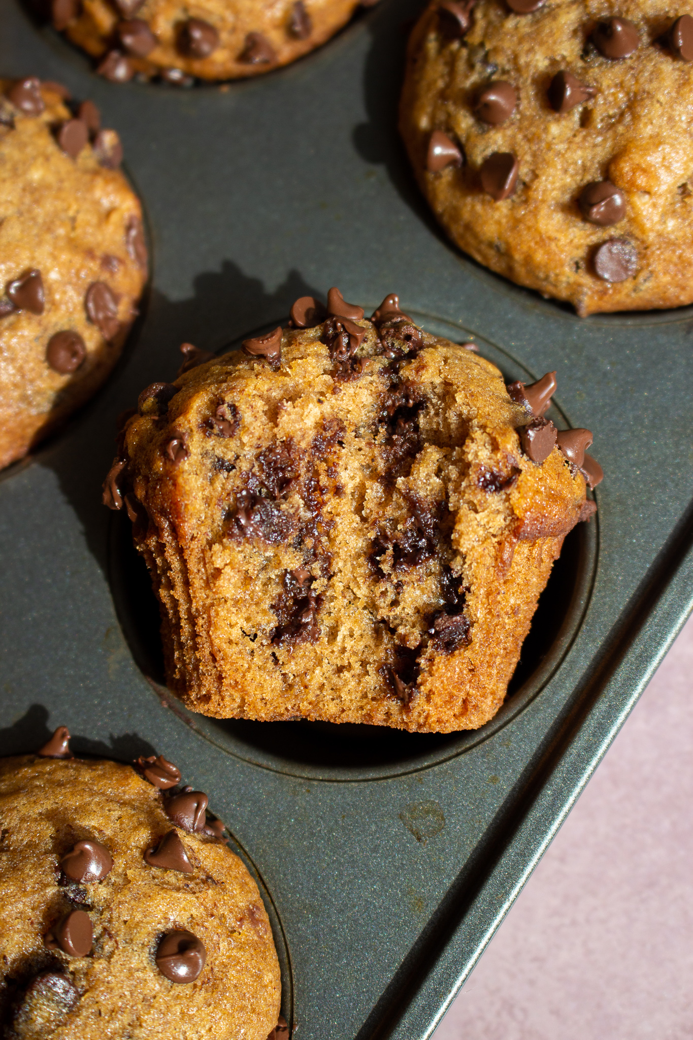 Applesauce Chocolate Chip Muffins are easy muffins full of warm spices, hints of apple, and pockets of melty gooey chocolate.