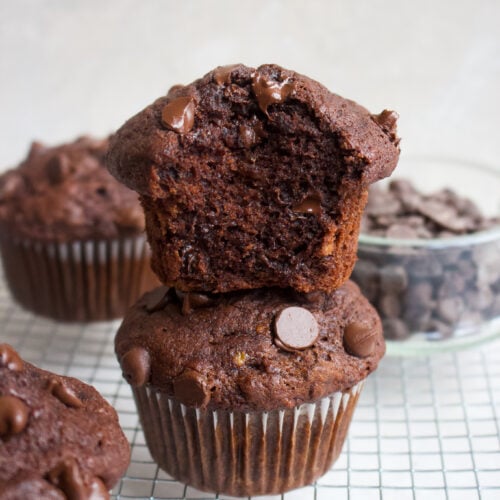 Scoop and divide the batter evenly between the liners. Sprinkle extra chocolate chips on top if desired.