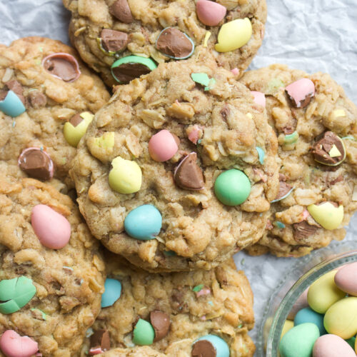 Scoop the cookies onto a cookie tray (I scooped 6 per tray and used a 2 tbsp cookie scooper), spacing them evenly apart from one another. Gently flatten the cookies for better spreading. Add extra mini eggs on top if desired.